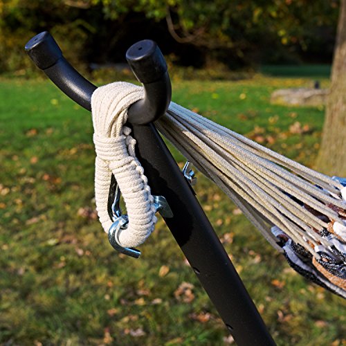 HAMMOCK & STEEL STAND SET: The sturdy space saving frame stand is made of heavy duty, construction grade steel, and is completely weather resistant and designed to easily carry up to 500 pounds. Stand Dimensions: 10' x 3.9' x 3.5'