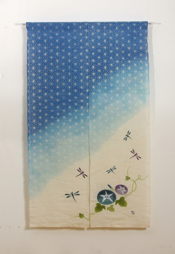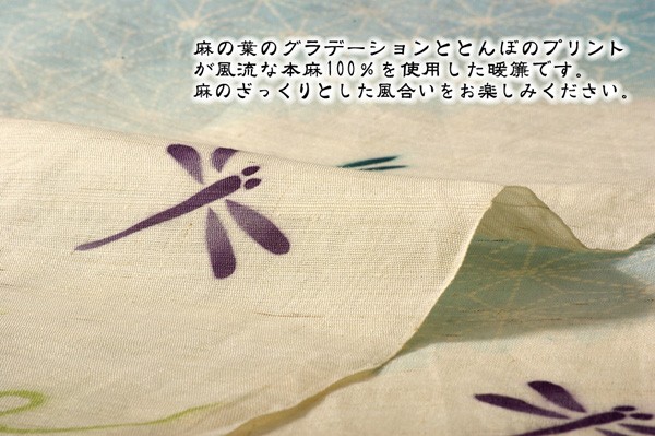 風物詩をあしらった麻暖簾です。強度に優れた麻生地を使用しています。程良い透け感のざっくりとした質感に仕上げました。また、通気性が良いので自然の空気を通します。生地は熟練の職人さんが手織りで仕上げております。手織り独特の温かみのある風合いをお楽しみ下さい。強い日差しを和らげる日よけとして、やわらかな目隠しに、間仕切りに、和の空間づくりになどご使用下さい。※のれん棒は付いておりません。