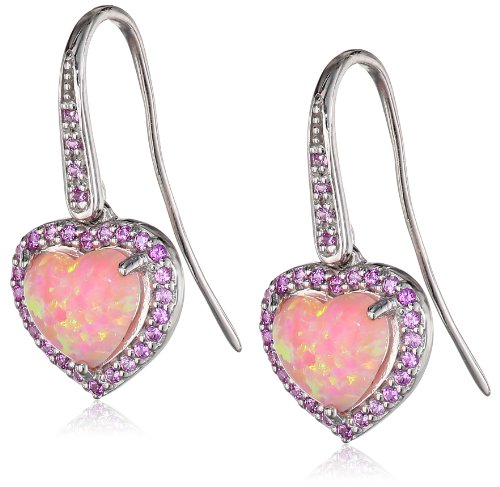 Simulated Opal and Created Pink Sapphire Heart Hook Earrings in Sterling Silver