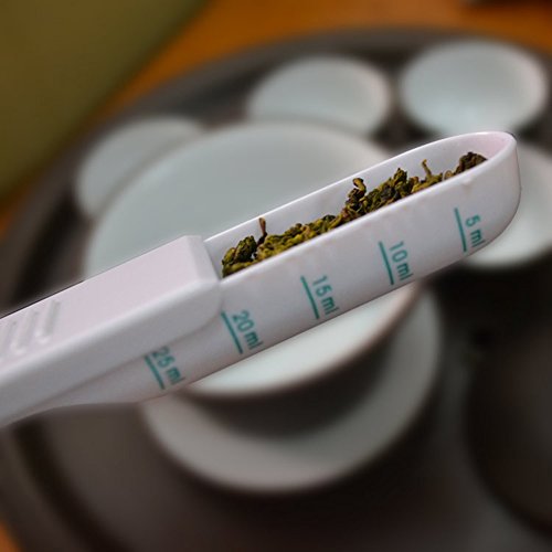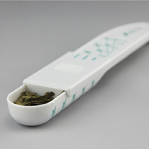 Adjustable spoon measures precise amounts of bulk tea for brewing 1 to 7 cups pf weak, regular, or strong tea
