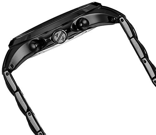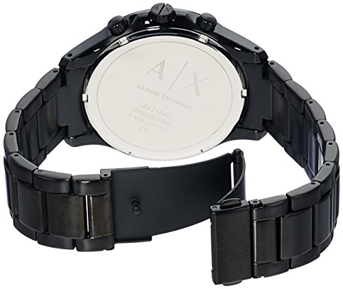 Black PVD stainless steel case with a black PVD stainless steel bracelet. Fixed black PVD bezel. Black dial with black hands and index hour markers. Minute markers around the outer rim. Dial Type: Analog. Chronograph - sub-dials displaying: three - 60 second, 60 minute and 1/10th of a second. Quartz chronograph movement. Scratch resistant mineral crystal. Pull / push crown. Case diameter: 46 mm. Case thickness: 7 mm. Round case shape. Band width: 22 mm. Deployment clasp. Water resistant at 50 meters / 165 feet. Functions: chronograph, hour, minute, second. Sport watch style. Armani Exchange Chronograph Black Dial Mens Watch AX2164.Feature