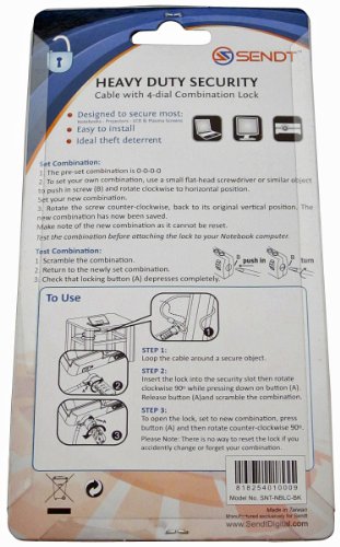 -. Binding : Electronics -. Brand : Sendt -. Label : Your Cable Store -. Manufacturer : Your Cable Store -. PackageQuantity : 1 -. ProductGroup : CE -. ProductTypeName : CONSUMER_ELECTRONICS -. Publisher : Your Cable Store -. Studio : Your Cable Store -. Title : Sendt Notebook / Laptop Combination Lock Security Cable