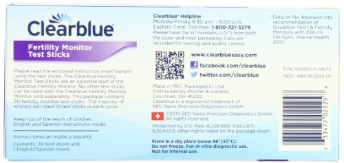 For use with the Clearblue Fertility Monitor, the Clearblue Fertility Monitor Test Stick pack includes 30 individually wrapped test sticks. The majority of women who are trying to conceive will need 10 test sticks each cycle. Women with irregular or long cycles may have to use 20 test sticks each cycle. The Clearblue Fertility Monitor maximizes a womans chances of conceiving a baby by identifying typically 3x more fertile days compared to traditional ovulation tests. This electronic, handheld fertility monitor tracks two key ovulation hormones to pinpoint 2 Peak Fertility days and 15 High Fertility days for most women. Sometimes referred to as an ovulation predictor or pregnancy calculator, the Clearblue Fertility Monitor is the most advanced way of tracking fertility, and the only non-invasive method that detects both LH and estrogen hormones. Clearblue is the #1 brand recommended by OB/GYNs.Feature