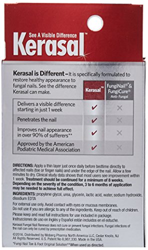 Kerasal Fungal Nail Renewal Treatment is a topical formula that is clinically reduce to rapidly improve the appearance of unsightly nails damaged by fungus or psoriasis. Kerasal Nail normalizes thickened nails, reduces nail discoloration, and softens and rehydrates brittle nails. Kerasal Nail has been developed by dermatologists in Sweden and is based on 15 years of targeted research and development.Feature