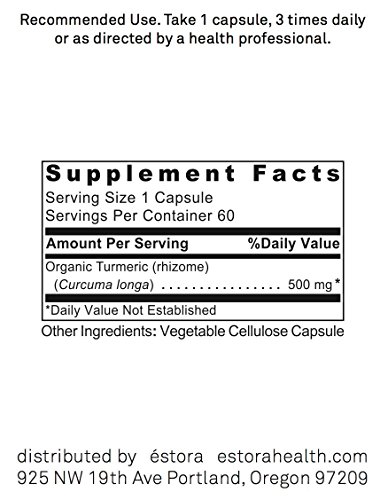 -. Feature : BE YOUR BEST SELF: Natural antioxidant that supports healthy digestion as well as heart and liver functions. / ROOTED IN TRADITION: Turmeric has been used for centuries not only as an anti-inflammatory but also as a remedy for skin care, obesity, and joint pain. / PURELY TO THE POINT: Contains organic turmeric (rhizome) with no substitutes or additional ingredients. / LIVE SOURCED INGREDIENTS, TESTED FOR MAXIMUM ABSORPTION: All éstora Health raw ingredients and finished products are independently tested & certified to ensure you receive the purest and highest quality supplement for maximum absorption. / THE ÉSTORA HEALTH GUARANTEE: Our products don't contain any fillers of any kind, no magnesium stearate or any undesirable excipients. You will never find artificial flavorings, colors or preservatives in our products. Our UV Blocking bottle is designed to protect the nutrient content by blocking light-damaging frequencies.