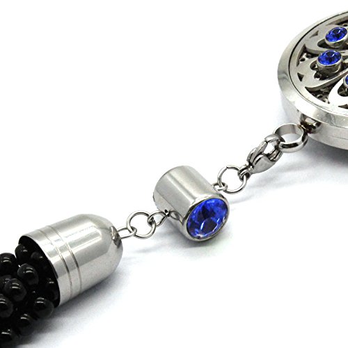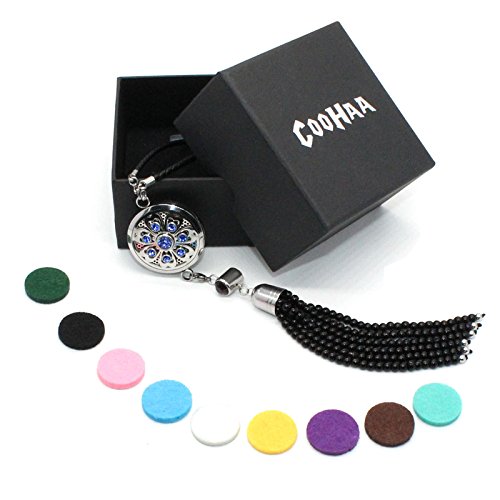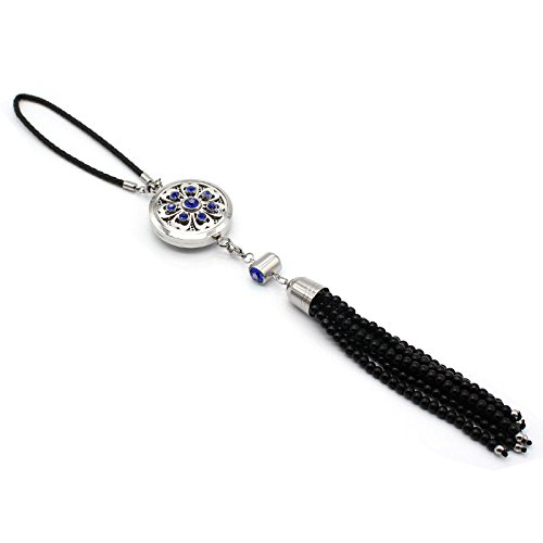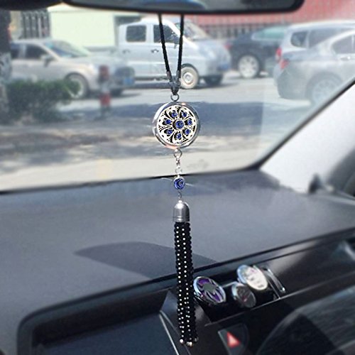 COOHAA sunflower car essential oils that symbolize luck,enthusiasm and light. handmade black agate tassel with lavender blue crystals locket and black leather hanging loop making it easy to install on your mirror!