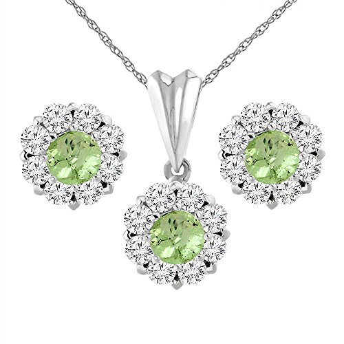 -. Title : 14K White Gold Natural Peridot Earrings and Pendant Set with Diamond Halo Round 6 mm