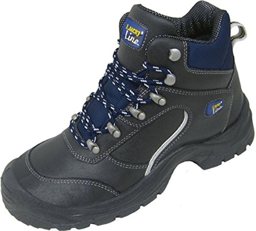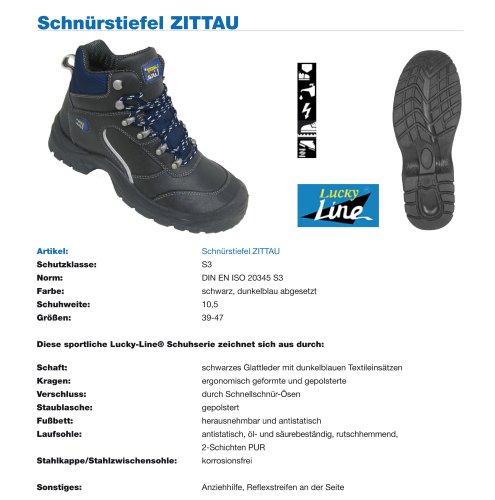 -. Feature : Diese sportliche Lucky-Line® Schuhserie zeichnet sich aus durch: / Schaft aus schwarzem Glattleder mit dunkelblauen Textileinsätzen ergonomisch geformter, gepolsterter Schaftrand Verschluss durch Schnellschnür-Ösen / angenähte, gepolsterte Staublasche herausnehmbares und antistatisches Fußbett Anziehhilfe / antistatische, öl- und säurebeständige, rutschhemmende 2-Schichten PUR Laufsohle Reflexstreifen an der Seite