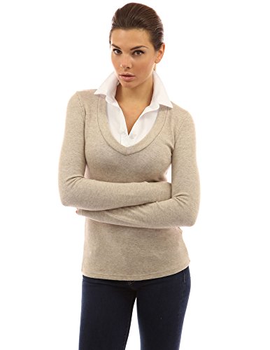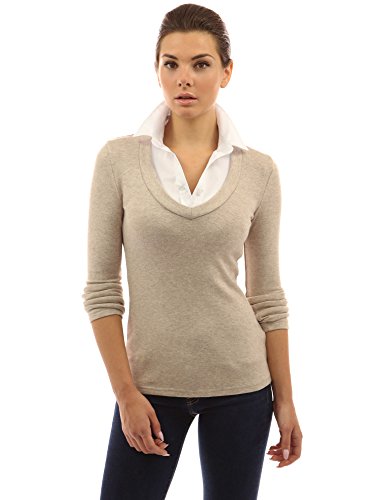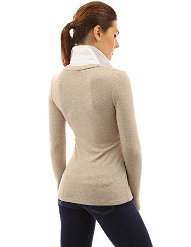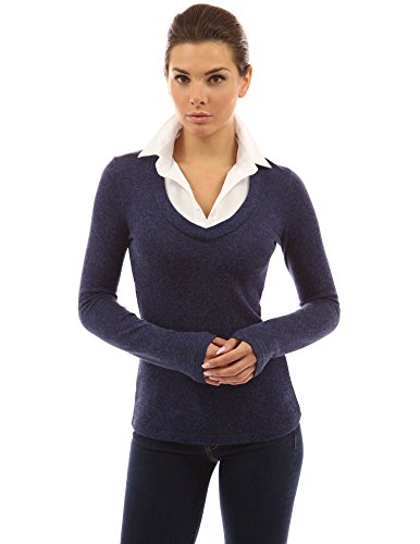 PattyBoutik Shirt Collar Inset 2 in 1 Style Long Sleeve Pullover Textured Blouse Top. Model in pictures is 5 feet 8 inches (173cm) tall wearing size S.