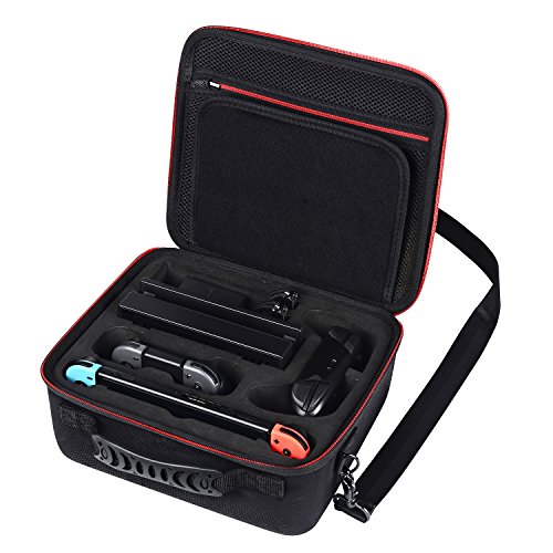 -. Feature : Custom design to fit complete Nintendo Switch system(switch console, dock, power adapter, joy-con grip even with extra joy-con, joy-con straps, and HDMI cable) and extra Switch Pro controller, hold 21 game cards and other little accessories. / High quality pre-cut foam protects complete Switch system and Pro controller well, the case is deep enough, no compression to any buttons, so the pro controller and joy-con won't be activated by pressed. / This Zadii carrying case for Switch is made of environment friendly odorless material, you can hardly smell pungent odor. / The mesh pouch enlarges room for storing HDMI cable and other accessories, keep them organized and safe. / Comes with a comfort shoulder strap and non-slip handle to easily carry all of your switch set on trip.