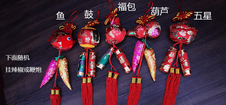 产品按元宝、宫灯、葫芦、卡通鱼、钱袋区分,下方吊坠的鞭炮、辣椒、福袋等会有所区别,但一定和谐搭配,购买时请留意。