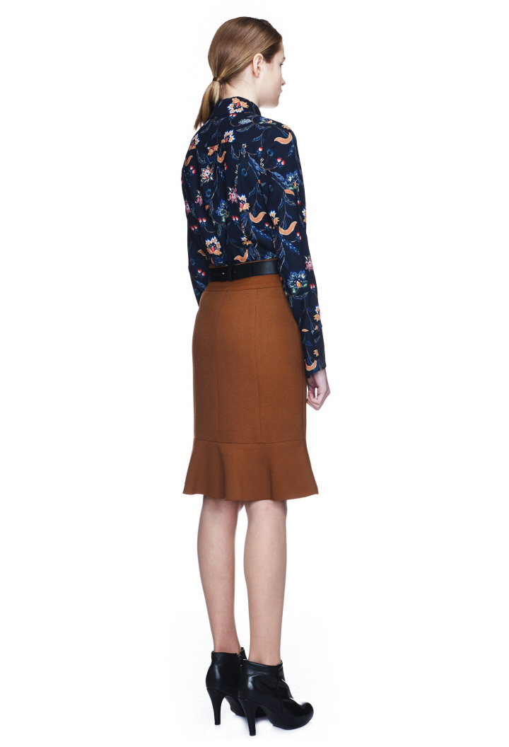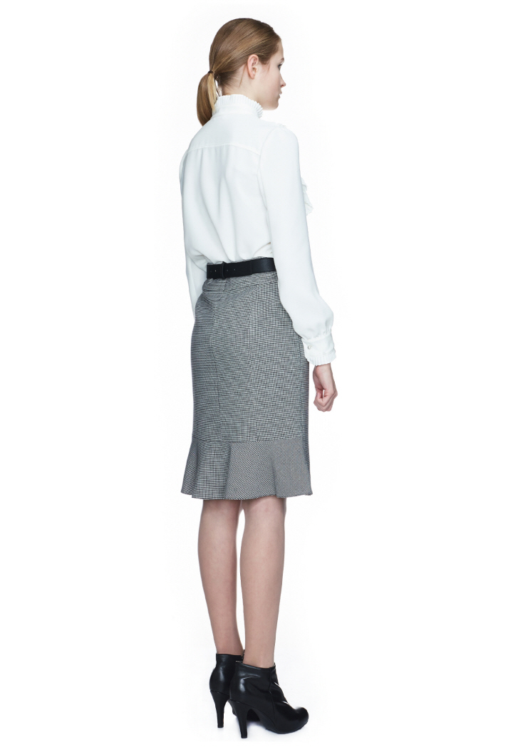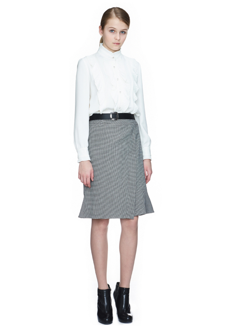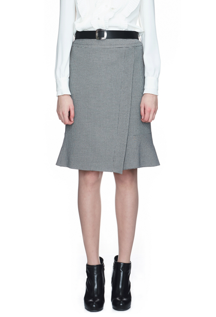 39(블랙)은 체크 패턴이며, 54(카멜)은 패턴 없는 무지 스타일입니다. 세련된 무드의 스커트입니다. H라인으로 슬림하게 떨어지는 디자인에 허벅지 아래로 자연스럽게 퍼지는 페블럼 디자인이 여성스러움을 돋보이게 합니다. 모델신장은 174cm, 55사이즈를 착용하였습니다.