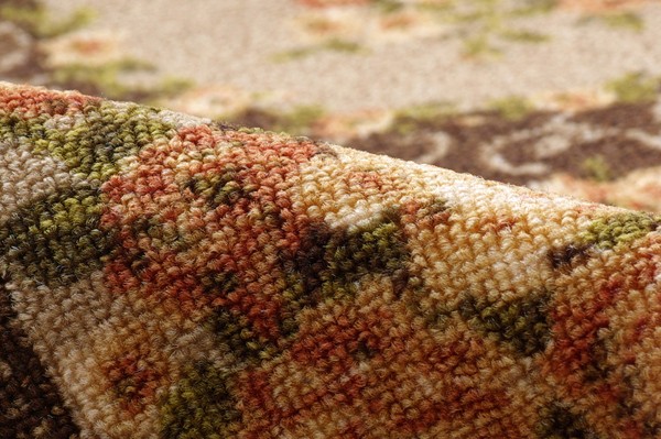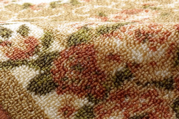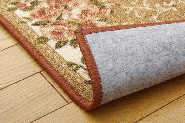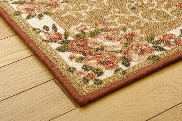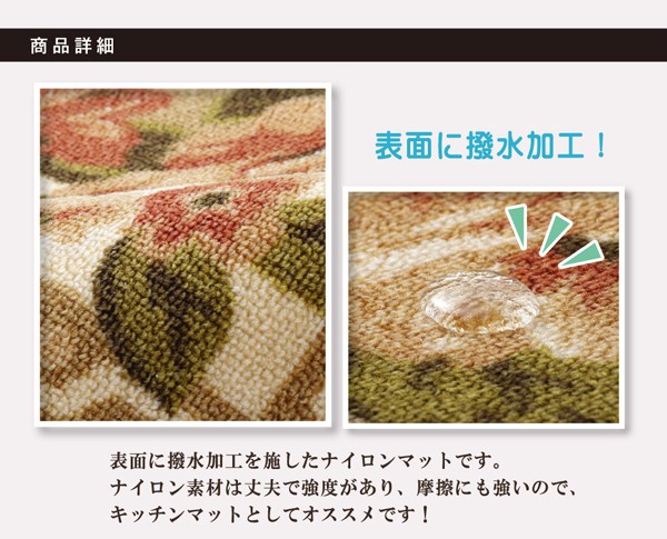 絵羽柄のカーペットです。表地には撥水加工を施しておりますので、汚れにくくお手入れも簡単です。表地のパイル部分にはナイロンを使用しています。ナイロンは強度や摩耗に強く、速乾性があり、また遊び毛も出にくいなどの特徴があります。季節を選ばず、オールシーズンご使用頂けます。同柄のラグサイズ・敷き詰めサイズも取扱いがありますので、トータルでのコーディネートもお勧めです。フローリングを傷つけにくいよう、裏には不織布を貼っております。※キッチンマットサイズのみ滑りにくい加工を施しています。