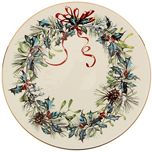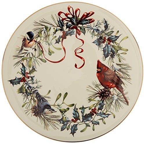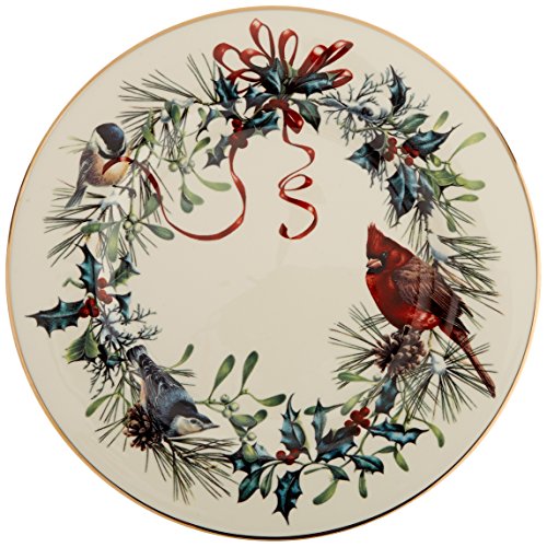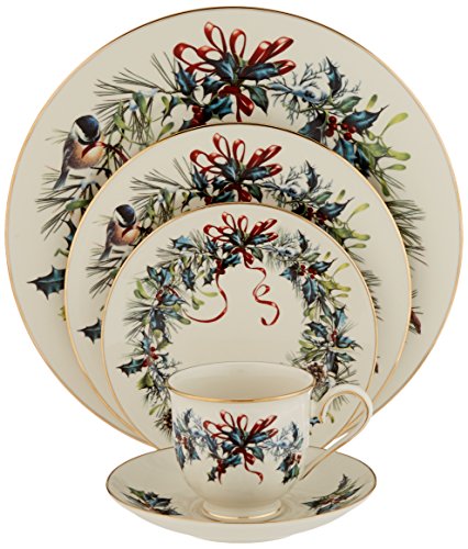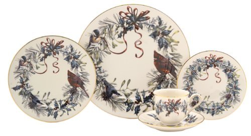 Amazon.com Review Crafted from fine china with festive imagery and gold rims, Winter Greetings dinnerware makes a holiday table instantly merry. The pattern features classically rendered holly branches, mistletoe, chickadees, cardinals, berries, and ribbons. Original creations by Lenox artist Catherine McClung, the images vary on each piece and are intricately detailed. Rims of 24-karat gold add a rich finishing touch. Five pieces in all, the place setting includes a 10-3/4-inch dinner plate, an 8-1/8-inch salad/dessert plate, a 6-1/2-inch bread and butter plate, a 6-inch saucer, and a 6-ounce teacup. The gold trim on the teacup accents the rim, the foot, and the edges of the curved handle. The set is dishwasher-safe and covered by Lenox's lifetime replacement policy. The Winter Greetings pattern is also available in numerous accent and serving pieces. --Emily Bedard What’s in the Box 1 place setting. Place setting consists of: 10-3/4-inch dinner plate; 8-1/8-inch salad/dessert plate; 6-1/2-inch bread/butter plate; 6-ounce teacup; 6-inch saucer. 5 pieces total. 0