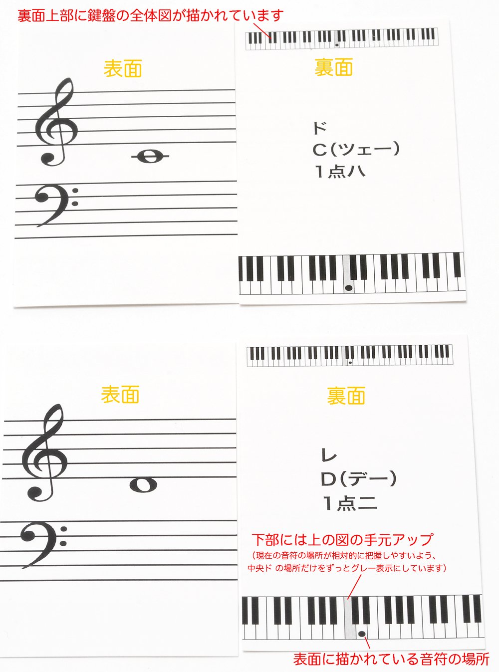 On the back side is a picture of the keyboard and black dots (locations of notes), so you can tell where the note on the surface is on the keyboard.