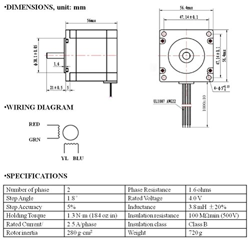 Zyltech Nema 23 Stepper Motor 2.5 A 1.3 Nm 184 oz.in 56mm Body w/ 1m Cable for 3D Printer/CNC