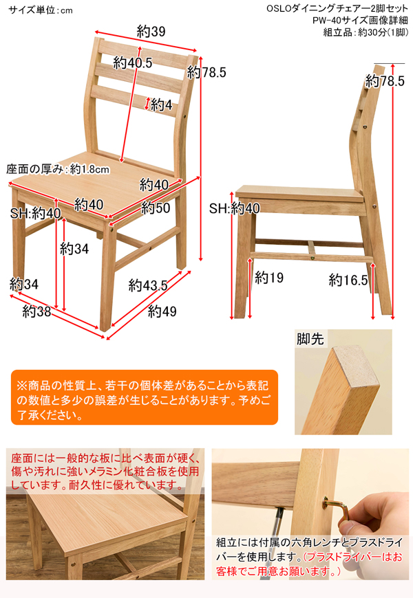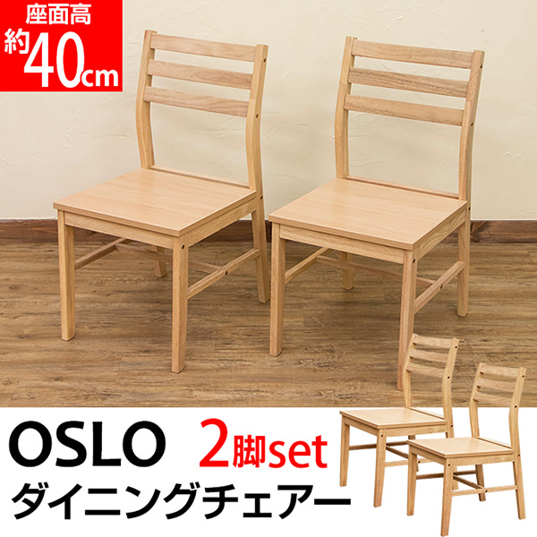 本商品はお取り寄せ商品のため、稀にご注文入れ違い等により欠品・遅延となる場合がございます。誠に恐れ入りますが、何卒ご了承ください。 また、以下の場合には追加送料がかかる場合がございます。  ・大型商品の複数購入時 ・同梱区分が異なる商品の複数購入時  【出荷目安】:1 - 4営業日 ※土日・祝除く 【同梱区分】:TS 1490 【梱包サイズ】:大型商品 【代引き決済】:不可  配送伝票の依頼主は出荷元(メーカーもしくは仕入元)名となる場合がございますので、お受け取りの際はご注意ください。   【型番】PW40  【商品名の色やサイズについて】 こちらは「ダイニングチェア/リビングチェア 【2脚セット】 木目調 『OSLO』 座面高:約40cm」の商品ページです。商品画像や商品情報には、色違いやサイズ違いの商品が載っている場合がございます。ご注文前に色・サイズ・セット内容のご確認をお願いいたします。  OSLO ダイニングチェア 2脚セットです  座面は一般的な板に比べ表面が硬く傷や汚れに強いメラミン化粧合板を使用しています 耐久性に優れています  ナチュラルカラーがお部屋に馴染みやすいです  【天然木は継ぎ目や節目、木目がございます】  幅400×奥行500×高さ785mm(梱包サイズ:幅835×奥行535×高さ105mm) 座面高:約400mm 本体重量:1脚 5.1kg(梱包重量:12.4kg) 組立式(1脚 約30分/付属の工具にて組立、プラスドライバーをご用意下さい)1個口 座面:メラミン化粧合板 その他:天然木ラバーウッド(ラッカー塗装)  原産国:マレーシア  【ご注意事項】 ※本商品は、北海道・沖縄・離島への配送はいたしかねます。あらかじめご了承ください。