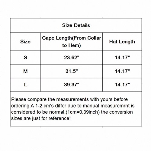 -. Binding : Apparel -. Brand : Samtree -. Department : unisex-baby -. Feature : Size:Please kindly check the size chart on the image, not the size chart link offered by Amazon system. / Material: Velvet; Weight(Approx): 160-200 gam / Quantity: 1 Pcs of cape with a pair of cat,skull or other pattern small stud earrings for gift; / These are incredible velvet cloaks can be used for a variety of occasions. It is perfect for Halloween, party, school stage show and year-around dress up fun,perfect for role play,stage costuming witches, vampires, royalty, and more.Look to rubies for all your character accessory needs. / It is one of the best gifts for kids to enjoy any festival. -. ProductGroup : Apparel -. ProductTypeName : ACCESSORY -. Title : Samtree Unisex Kids Hooded Cloak Halloween Role Play Costume Cosplay Cape