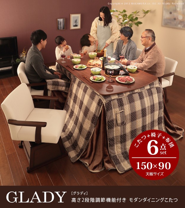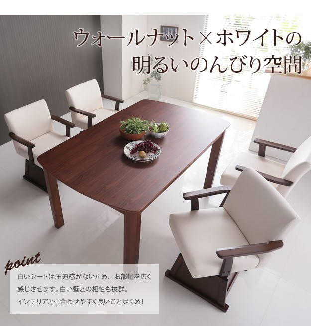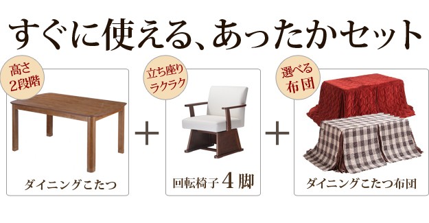 セット内容:こたつx1台、こたつ布団x1枚、肘付回転椅子x4脚