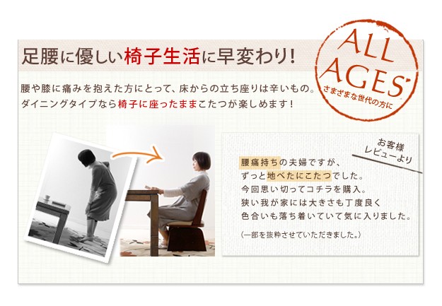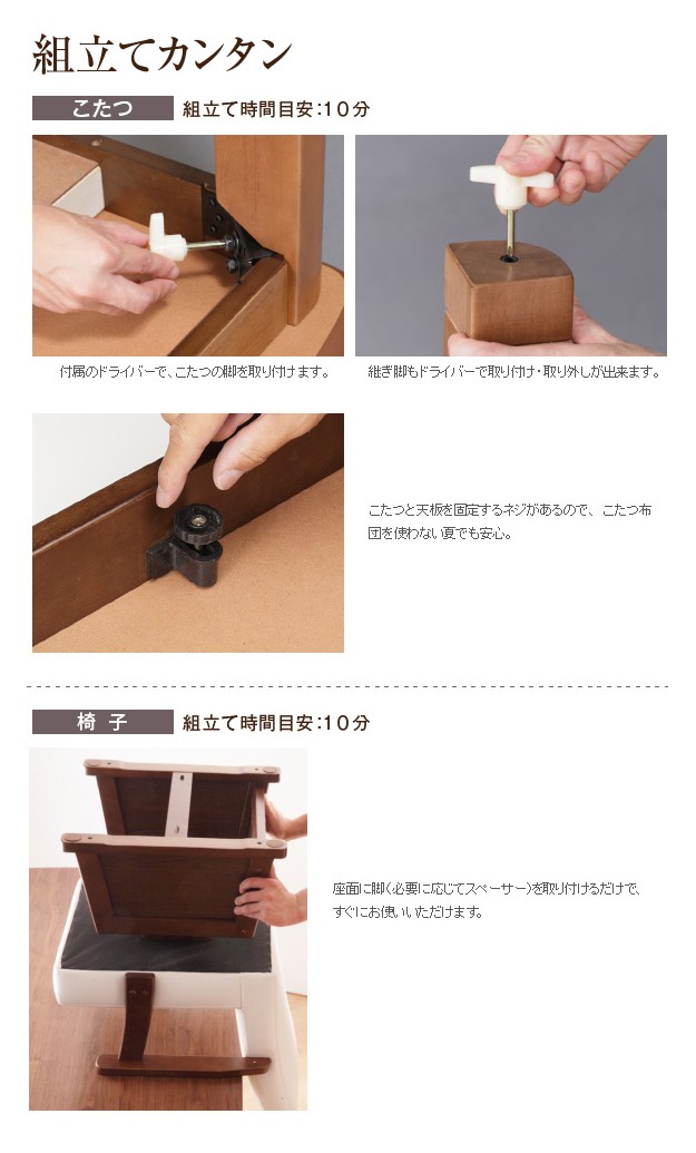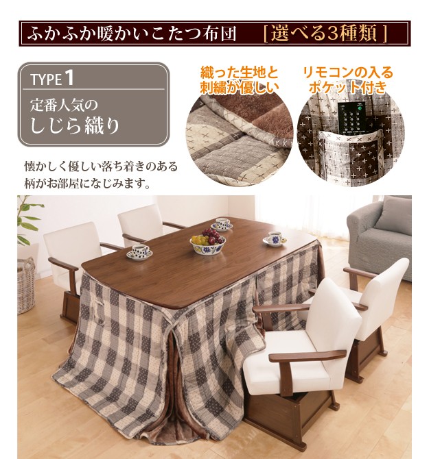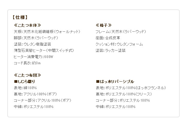 材質:こたつ天板-天然木化粧繊維板(ウォールナット)、幕板・脚部-天然木(ラバーウッド)、椅子本体-天然木(ラバーウッド)、布団表地-しじら/綿100%、レンガ・ベージュ/ポリエステル100%(撥水フランネル)