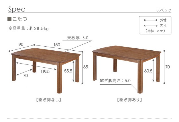 サイズ(cm):こたつ-幅150x奥行90x高さ70(65)・約28.5kg、椅子-幅57x奥行54x高さ72(67)・約10.5kg、布団-310x250cm