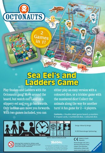 -. Binding : Toy -. Brand : Ravensburger -. EAN : 4005556210558 -. Feature : A fun game for 2 - 4 players / Includes a double sided games board. / Use the numbered dice with side one and be the first to make it to the end. / Or use the easier coloured dice game to be the first to win. / Features all of the Octonauts gang and interesting sea creatures. . -. IsAdultProduct : 0 -. Label : Genuine Ravensburger -. Manufacturer : Genuine Ravensburger -. Model : 21055 -. MPN : 21055 -. NumberOfItems : 1 -. PackageQuantity : 1 -. PartNumber : 21055 -. ProductGroup : Toy -. ProductTypeName : TOYS_AND_GAMES -. Publisher : Genuine Ravensburger -. Studio : Genuine Ravensburger -. Title : Ravensburger Octonauts, Sea Eels And Ladders Game