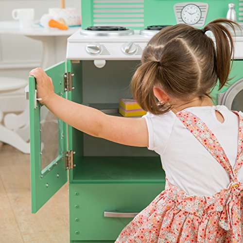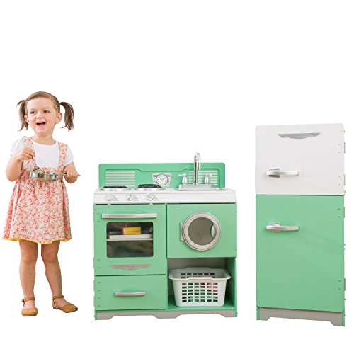 -. Feature : Includes laundry basket / Washer, oven, refrigerator, freezer and storage doors open and close / Modular design for flexible playroom layouts / Oven knobs turn and click / Sturdy wood construction