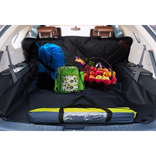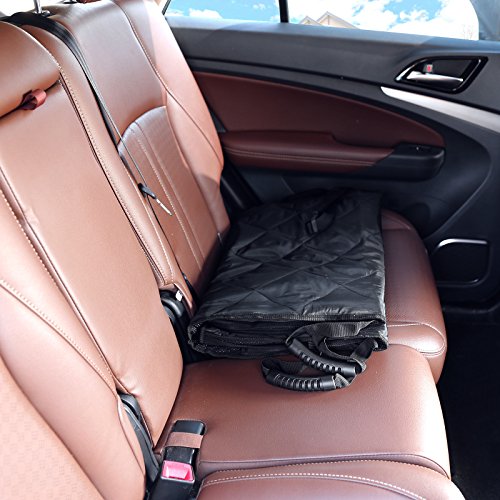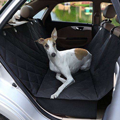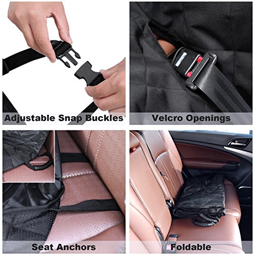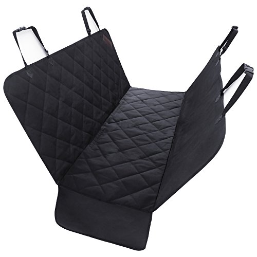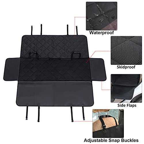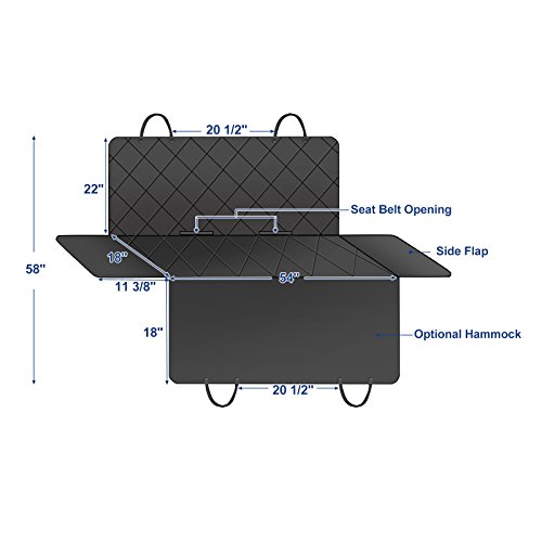 -. Feature : HAMMOCK WITH SIDE FLAPS: Easily converts between hammock and standard bench cover - when used as a hammock, the front side forms a barrier to keep pets from climbing up into the front seat; side flaps make it easy for your pet to get in or out of the car without scratching the car seats / WATERPROOF, DURABLE & COMFORTABLE: Multi-layered design made of 600D Oxford, PP cotton, polyester and non-slip backside; heavy-duty, waterproof and durable oxford fabric protects from liquid and scratches; PP cotton filling makes your furry pals more comfortable / NONSLIP & SAFE: Dimpled and rubberized coating on the back prevents hammock seat cover from sliding; 2 seat anchors keep the cover in place; seatbelts can pass through the built-in hook & loop opening; all these are considered to ensure the safety of your pets / PERFECT SIZE: Excellent size of 53 1/8"L x 57 1/8"W (135 x 145cm) for standard cars, trucks and SUVs; this seat cover can protect the entire back seat perfectly, letting you take a ride without worrying about liquid, dirt, scratches or hair / EASY TO INSTALL AND CLEAN UP: Quick release clips snap all four buckle straps around your car's headrests and insert the seat anchors to the crevice to fasten the cover; easy to clean with a damp cloth or vacuum; Machine Washable on Gentle Cycle recommended