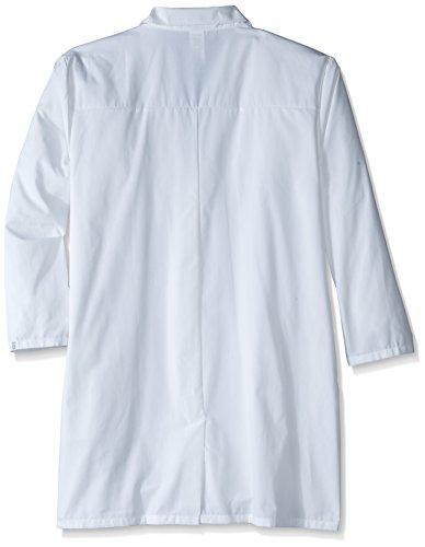 - Unisex fit lab coat with a notched collar and a four button front closure