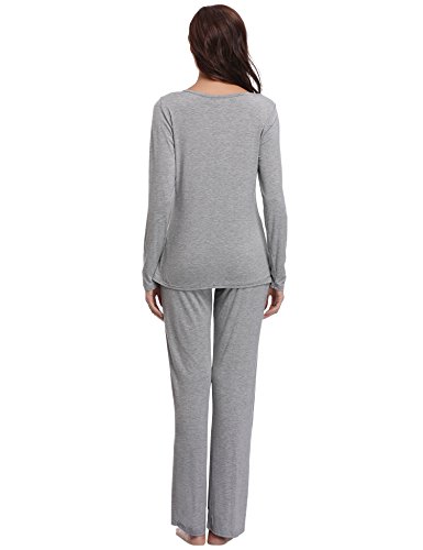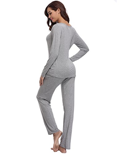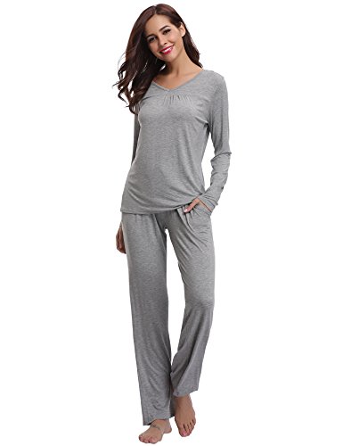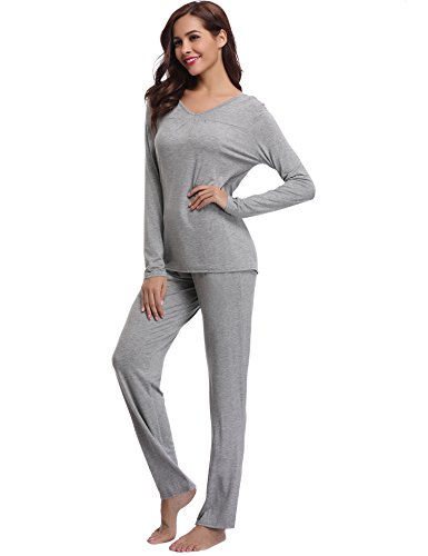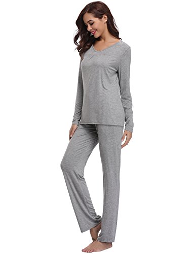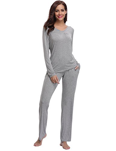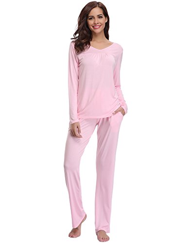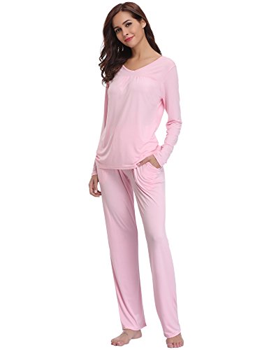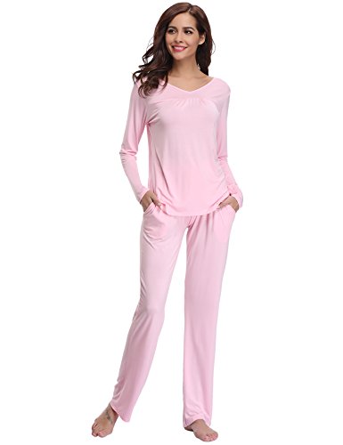 -. Feature : 【Pajamas Set Materials】:95% Viscose (made from Bamboo), 5% Spandex. / 【Super Soft Sleepwear set】:Pajamas for women made of premium Bamboo with great elasticity, ultra soft and breathable, has moisture-wicking performance and provides you with extraordinary wear experience. / 【Light Weight Pajamas】: Bamboo pajamas are incredibly comfortable, You hardly know you are wearing them. / 【Simple design】: V neck pullover tops shirt in black , grey and pink, long Sleeves pajamas pant with drawstring elastic waist. / 【Must-have Sleepwear】:The fabric is really soft ,Lightweight pajamas somewhat silky to the touch and comfortable to sleep in or wear around the house.