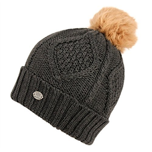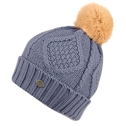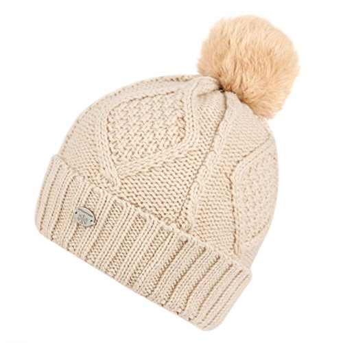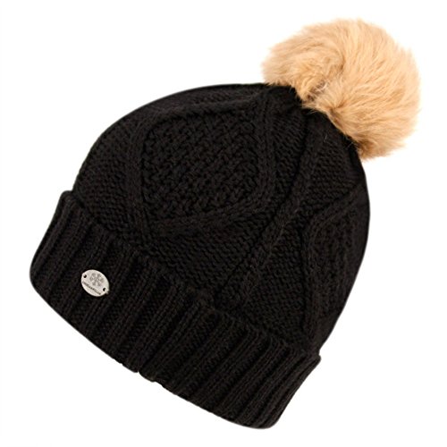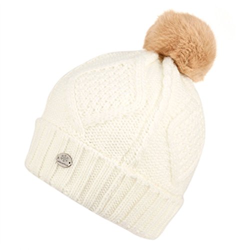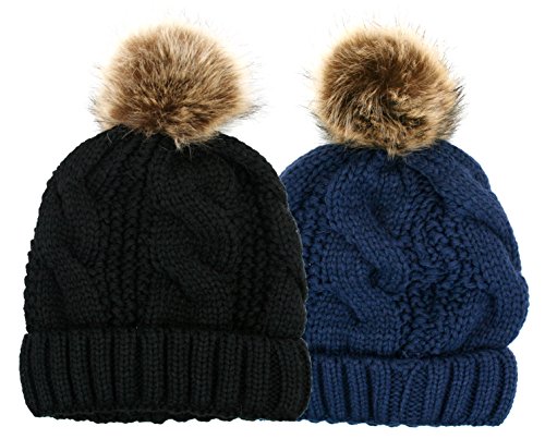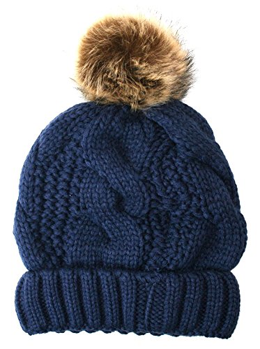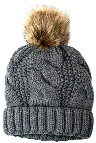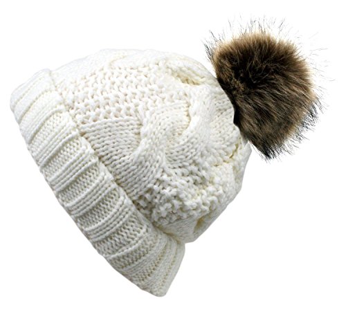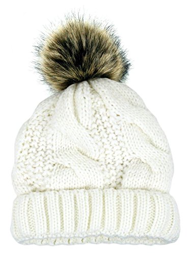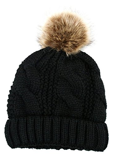 | Women's Thick Cable Knit Beanie Hat with Soft Faux Fur Pom Pom |