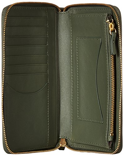 A zip-around closure secures the flat-lying interior of our compact zip wallet. The interior features Nine credit card slots, three slip pockets and a zip pocket. An exterior slip pocket is accented by a curved detail.