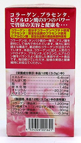コラーゲンは動物のからだの中の結合細胞に多く含まれるたんぱく質のひとつです。加熱するとゲル化する性質をもち、食物繊維の仲間でもあります。そのコラーゲンを12粒中に1200mg配合。コラーゲンの生成をサポートするビタミンCは水溶性のビタミンで、体内に蓄積できない不足しがちなビタミンで、12粒中に135mg配合しています。コンドロイチンは食物繊維の仲間でもあり、コラーゲンとともに結合組織を構成しています。コンドロイチン含有のサメ軟骨エキスを12粒中60mg配合しています。ゼリー状物質がたっぷりと水分を保つことでハリと弾力のあるみずみずしい肌をつくりだすプラセンタを12粒中30mg配合しています。弾力や潤いを与える重要な働きをしています。年齢を重ねると、ヒアルロン酸が減少し、角質層における保水力が落ちて、お肌は水分不足となりがちです。この重要な成分である鶏の鶏冠から抽出したヒアルロン酸を12粒中に0.3mg含有しています。それぞれの美容にうれしい成分をバランス良く配合した美容サポート食品です。