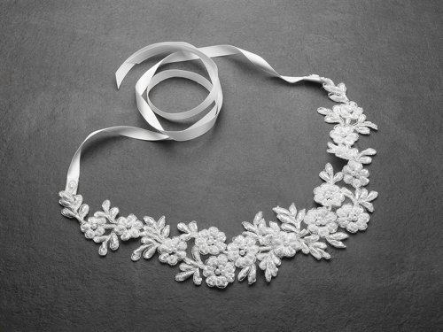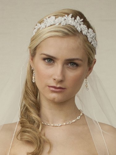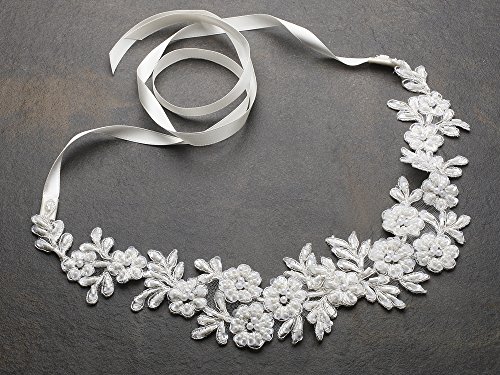 Studio : Mariell Publisher : Mariell Binding : Misc. Product Description Fragrant garden weddings come to mind when you set eyes on Mariell's delicate ivory lace bridal headband. This gorgeous lace bridal headband, featuring accents of pearls, sequins and bugle beads, has the romance and charm of a garden wedding! Meticulously sculpted edges highlight the headband's exquisite floral lace measuring 15 1/2" across 2 1/2" w. Each side has 19" satin ribbons 3/8" w.