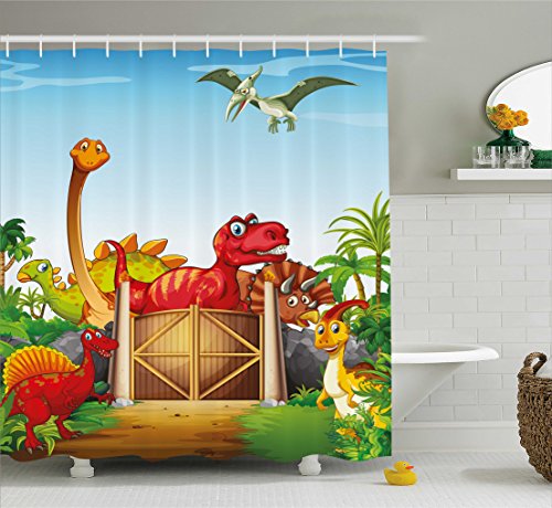 Kids Shower Curtain by Ambesonne, Cartoon Style Cute Dinosaurs in a Dino Park Jungle Trees Wildlife Habitat Illustration, Fabric Bathroom Decor Set with Hooks, 70 Inches, Multicolor
