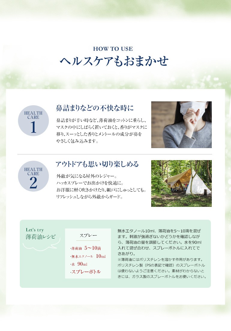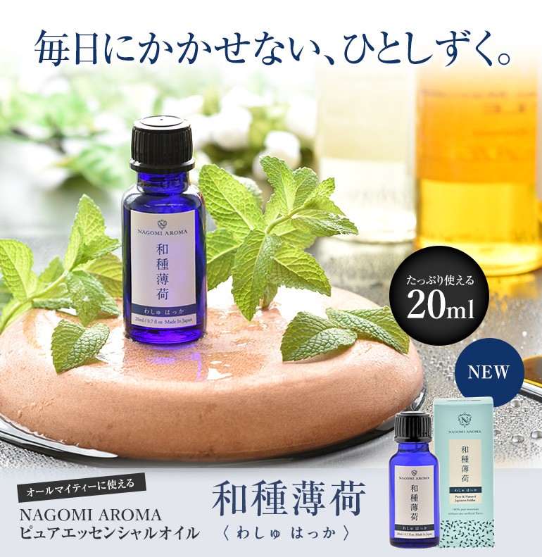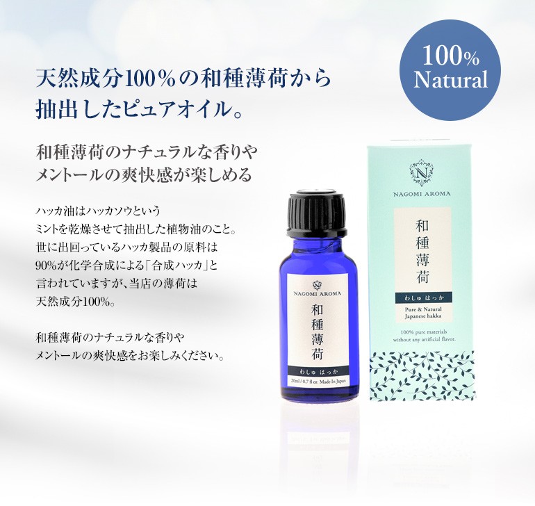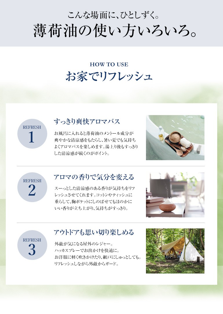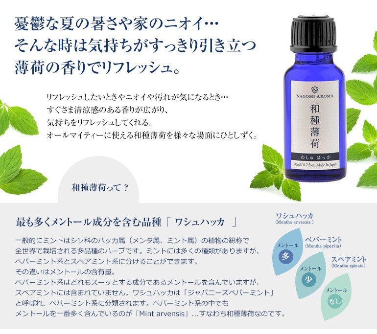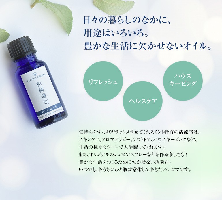 ペパーミントに芳香が似ていますが、メントールが多いため、より強い清涼感をお楽しみいただけます。すーっとするハッカの香りが和を感じさせてくれます。