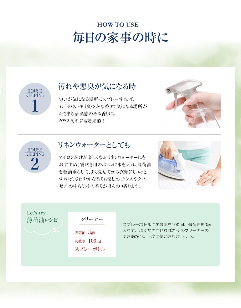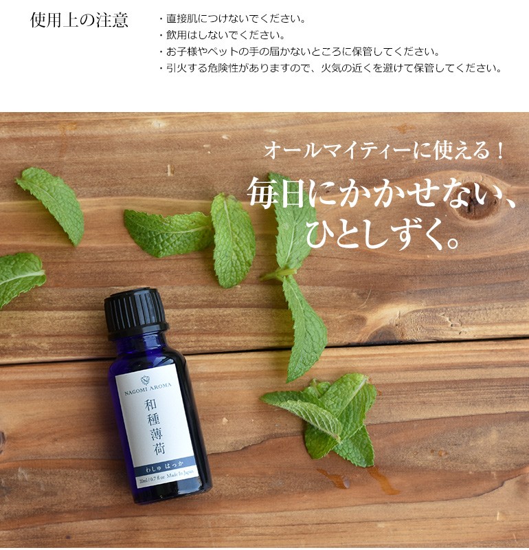 アロマテラピーで使用する際は、100%天然の「エッセンシャルオイル」をご使用ください。