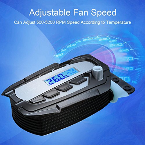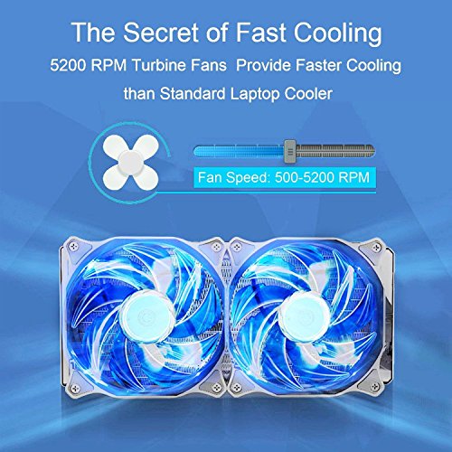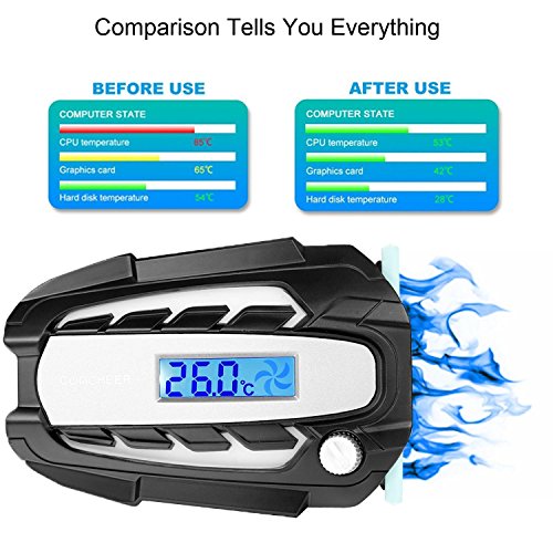 -. Feature : ❄ Extremely Effective Cooling System: With high efficient vacuum fan (500-5200 RPM), this newly designed laptop cooler can reduce laptop 10 to 50 F degrees in one minutes and stabilizes the operation of the laptop / ❄ Adjustable Fan Speed: Rotary Switch Allows you to Adjust Suction Wind Speed at will, High Efficiency of Cooling Helps your Laptop to Cool Down in Seconds Especially for Gamers, Cooling Down Surface and Internal GPU/CPU Temperature Helps Improve Performance for Gaming or Long-time Normal Usage / ❄ Visualized operations: LED screen displays the air temperature from your laptop vent. There are automatic and manual adjustment modes / ❄ Noise-free Design: Stepless speeds to manage the airflow and noise; Noise is less than 25dbm, create a noise-free environment for your Time / ❄ Widely Application: This Laptop Cooler supports compatible for most major all 12 to 17 inch Notebooks