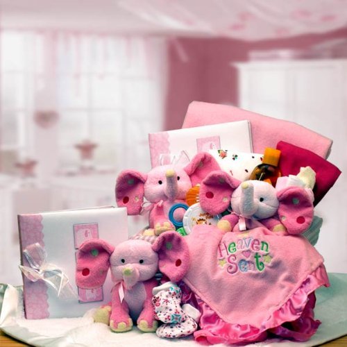 -. Feature : Celebrate the arrival of a beautiful baby girl with our The Heaven Sent Baby Girl Baby Gift Basket / Our The Heaven Sent Baby Girl Baby Gift Basket is the perfect baby shower and new baby gift / This basket comes filled with plush elephant, elephant security blanket, shampoo, photo ablum blanket, washcloths, teether and booties / This gift comes assembled in a fabric lined baby basket / This gift basket comes packaged in cellophane and includes handmade bow and personalized message! **Remember to check "gift" box in checkout**