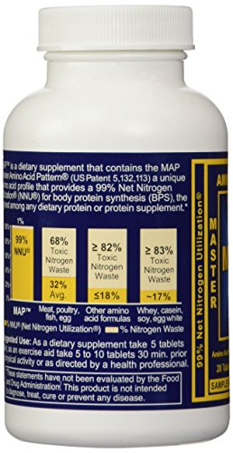 -. Binding : Health and Beauty -. EAN : 0849440002812 -. Feature : Increase your stamina and endurance augmenting protein intake / The basic building blocks of hair, skin, and muscle -- MAP is rapidly digested and typically only takes 23 minutes to digest fully* / 99% absorbed and utilized compared to 23% absorption for meat* / Use MAP before intense training to significantly reduce recovery time* / 100% sugar free! Great for weight loss, clean eating, and bodybuilding* -. IsAdultProduct : 0 -. Label : INRC -. Manufacturer : INRC -. PackageQuantity : 1 -. ProductGroup : Health and Beauty -. ProductTypeName : HEALTH_PERSONAL_CARE -. Publisher : INRC -. Studio : INRC -. Title : MAP Master Amino Acid Pattern 1000 mg 120 Tabs - 3 Pack - Free 20 Tabs -. UPC : 849440002812