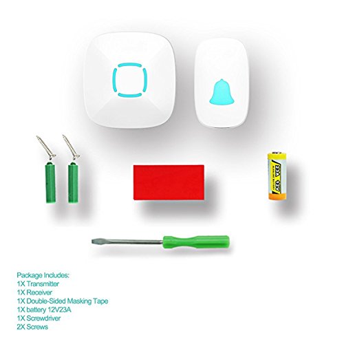 -. Feature : ✅ OPERATING RANGE - Wireless range up to 900ft that you will not miss any visitors, no matter where you are in door; / ✅ PERFECT USE - compatible with home furnishing, office buildings, hotels, factories; / ✅ 36 DIFFERENT RING TONES AND ADJUSTABLE VOLUME - Built-in stereo speakers make the sound crisper and sweeter; / ✅ STYLISH MODERN DESIGN - Artful with simplicity, elegant and unique. Excellent materials keeps itself from getting higher temperature & interference; / ✅ WHAT YOU GET - 1 x Push Button (Transmitter) ,1 x Plugin Chime (Receiver) ,2 x Screws ,1 x Double-Sided Adhesive Tape ,1 x 12V A23 battery for Transmitter,1 x Screwdriver,1 x User Manual;