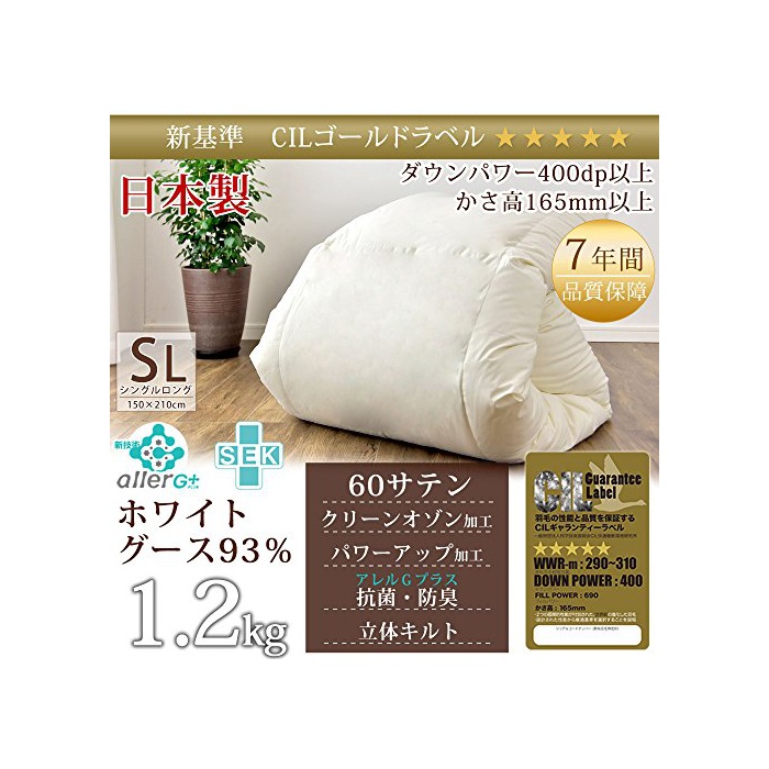 옷장의 겐 【증량1.2kg】 깃털 이불 화이트 goose 다운93% 싱글 롱 일본제 초길이 면 60새틴 7년 보증 400dp(인지(든가) 고165mm)이상 CIL골드 라벨 항균 소