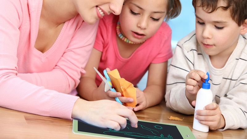 The LCD writing tablet's pressure-sensitive LCD writing surface creates lines of different thickness based on how hard you push - just like paper and pen.