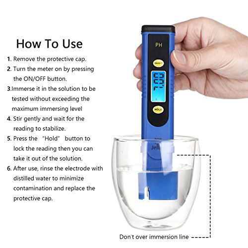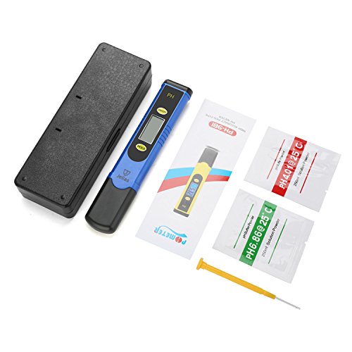 -. Feature : HIGH ACCURACY: The digital pH meter measuring range of 0-14 pH with 0.01 resolution which means that you can get the pH reading to TWO decimals, it's more accurate than the 0.1 resolution pH tester. / SIMPLE TO USE: Just remove the protective cap of pH meter, drop it in the solution and turn on the "ON/OFF" button to wait about 1 or 2 minutes for stable reading, then lock the pH reading by "HOLD" function. / LARGE BACKLIT LCD DISPLAY: When you turn on the pH meter, the blue backlight is lighting and it'll automatically turn off the LCD backlight to save power after four minutes. It's very effortless to read the number even in the sun. / WIDE APPLICATION: No doubt that it's the most ideal pH test kit for home and laboratory uses; household drinking water, RO system, Swimming pools, Aquariums, Spas, Hydroponics, Food, Wine and beer, Home brew making and more. / WHAT YOU GET: 1 × High Accuracy Digital pH Meter, 1 × Carrying case, 1 × Calibration screwdriver, 2 × pH buffer powder (for calibration), 1 × User manual; 90 Day's Hassle Free Return Warranty and Friendly Customer Service.