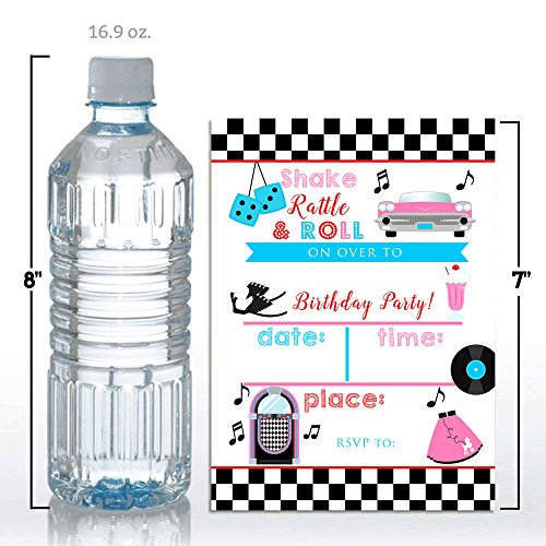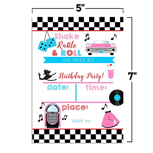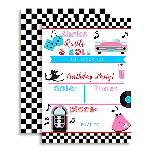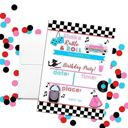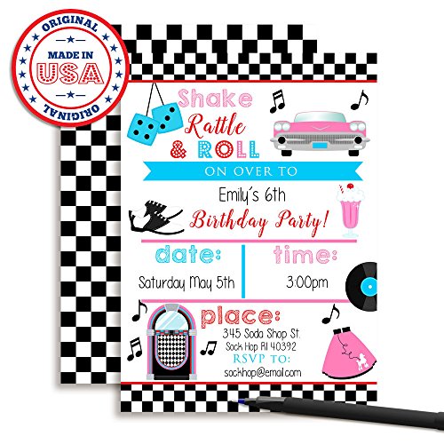 *** Bigger... Better... and Best of All... Cuter. 50's Sock Hop Birthday Invitations Designed by a Mom for Moms. Set of 10 Fill-In Postcards (5"x7" Each) Comes with 10 White Envelopes *** *2-sided printing for that added pop of color extra touch of quality *Larger 5"x7" size for bigger visual impact (most others are only 4"x5.5") *Heftier 80# cardstock with a smooth matte finish (so it's easier to write on) Even Includes Custom-Size Envelopes Hunting for just the right envelopes? Rest easy. Your 10 birthday postcards come with 10 crisp white envelopes, perfectly sized to fit the cards perfectly. What's more, you can count on these eye-popping invites for all-American craftsmanship: They're designed, printed carefully hand-packaged right here in the USA. To top it off, the complete set is fully backed by Amazon's 30-Day Guarantee. OMG, They're the Absolute Cutest... So Add to Cart Right Away!! Why choose Invitations from Amanda Creation? *Every invitation is custom designed by Amanda herself! *Amanda CreationTM has been in business since 2011 bringing unique party items to moms and children. *Our invitations are completely unique, you won't find designs like these anywhere else. Stand out with your celebrations and get the most creative and innovative invitations instead of mass produced invitations that can be found anywhere. *We pay attention to the smallest details, because they are hand designed complete care is taken in making them extra special to be the most beautiful invitations you have ordered. *We stand behind our product, if you are not completely satisfied for any reason simply contact us to return your product for a full refund. 0