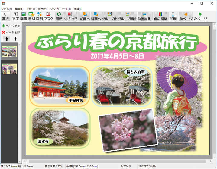 ●配置して写真に文字を書いたり、素材、図形で装飾して印刷します。