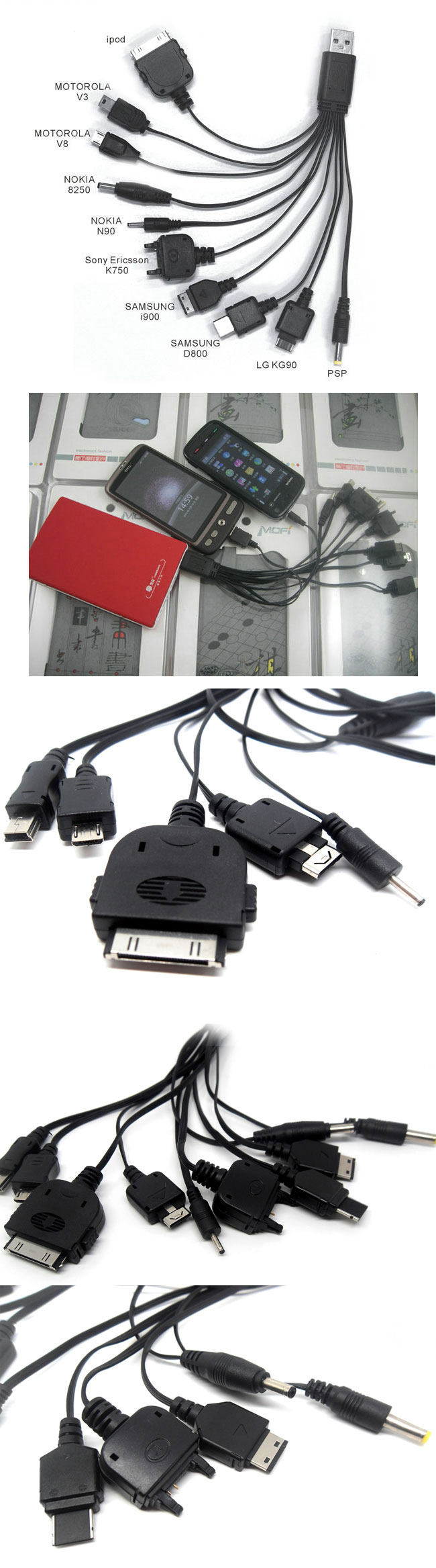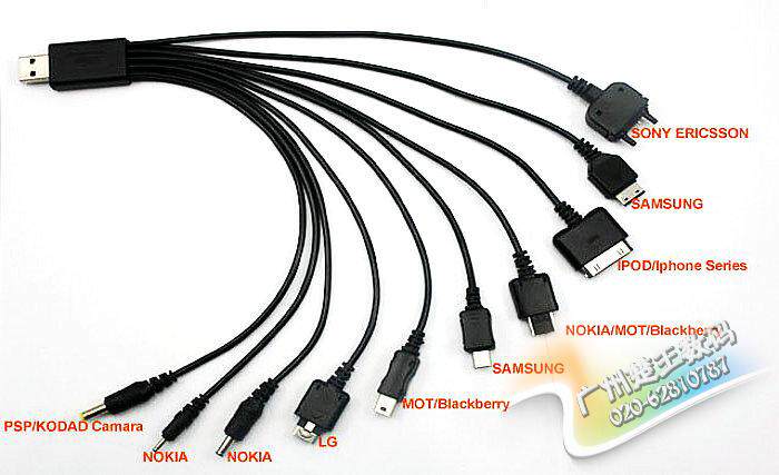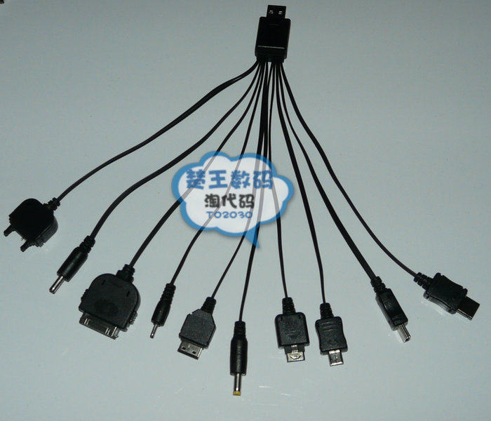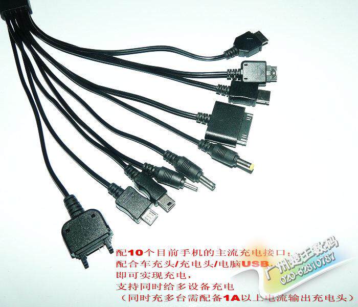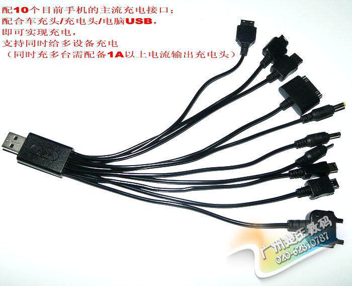 说 明:配10条现在手机的主流充电接口;配合车充头(或充电头,或电脑USB),即可实现充电,支持同时给多设备充电哦。