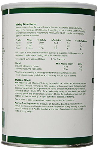 Made in the USA. Milk Matrix 42/25 is a low level lactose milk replacer component in the Zoologic Milk Matrix System which may be used alone for many Felids or blended with other components to formulate additional species specific milk replacers.Feature