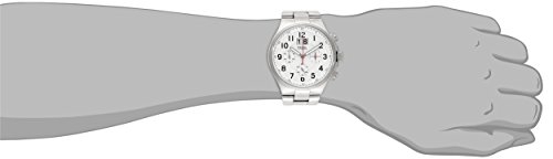 - Feature : Round watch in silver-tone brushed stainless steel featuring white dial with chronograph inner dial and large date window / 46 mm stainless steel case with mineral dial window / Analog quartz movement with analog display / Three-link bracelet with deployant buckle closure / Water resistant to 100 m (330 ft)