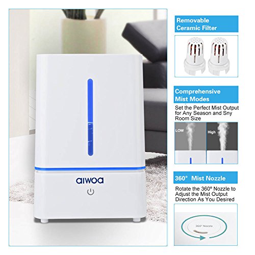 Studio : ALWOA Publisher : ALWOA Binding : Kitchen Product Description -Night Light: Mist machine offers soothing glow for maximum relaxation. -360-degree Mist Nozzle: Easy to adjust mist direction to fit your comfort level. -Easy to Use: Included cleaning tips for easy use and easy maintenance. -High/low Mist Mode: Easily switch between high and low mist modes, provides suitable mist amount. The ALWOA Home Humidifier is an ultrasonic humidifier that emits more tiny cool mist to help with dry skin, chapped lips, bronchitis, sinus problems, nose bleeds etc. This Cool Mist Humidifier use a mature Ultrasonic Technology with sleekly body design, make humidifier to be not only functional but also decorative. ? Notes: Humidify with cool boiled water or distilled water. Clean the water filter and tank once a week. Replace the used water and water base to keep the unit clean frequently. Pay attention to prevent falling from the height, this will break the machine. Do not add essential oil Directly into the tank,add to the independent box at the bottom. During the storage, clean or air-dry all parts and then place them in the original package. ? Package Include: 1 * ALWOA Ultrasonic Humidifier 2 * Filter 1 * Cleaning brush 1 * User Manual 0